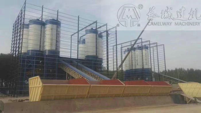 與工程攪拌站比較,標(biāo)準(zhǔn)攪拌站中增加了斜皮帶機(jī)和等待料倉。在主機(jī)攪拌的同時(shí),把配料機(jī)配送好的料傳送入等待料倉,等待攪拌??s短了提升時(shí)間,提高了生產(chǎn)效率。